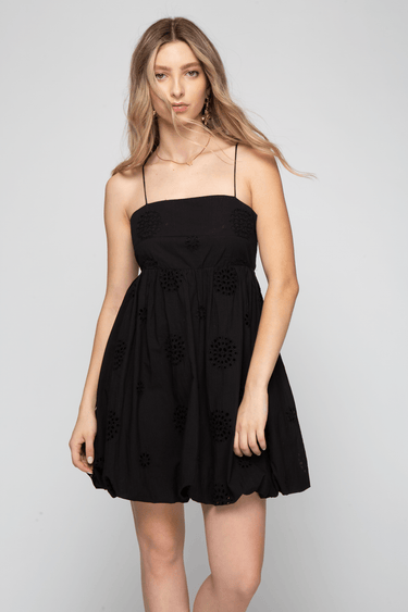Vestido corto de algodón bordado con tirantes finos ajustables, falda aglobada y apertura en espalda.